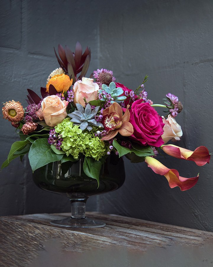 A beautiful pedestal bowl filled with bold blooms of roses, calla lilies, hydrangea, succulents, and more.