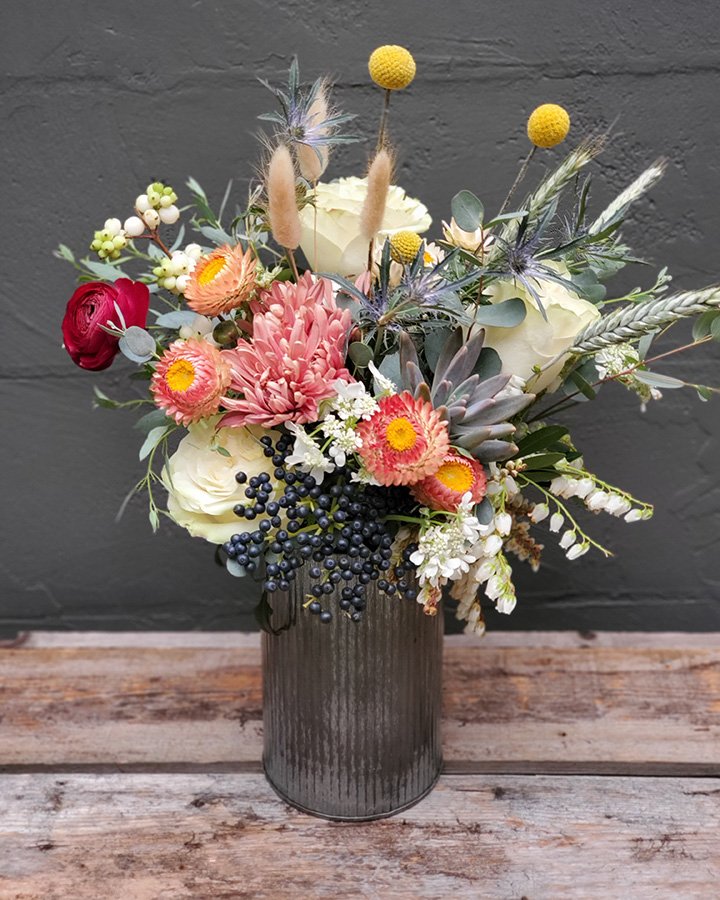 Delightful is a galvanized vase filler with roses and seasonal blooms and a succulent that can be planted after the arrangement has expired. Add ons.