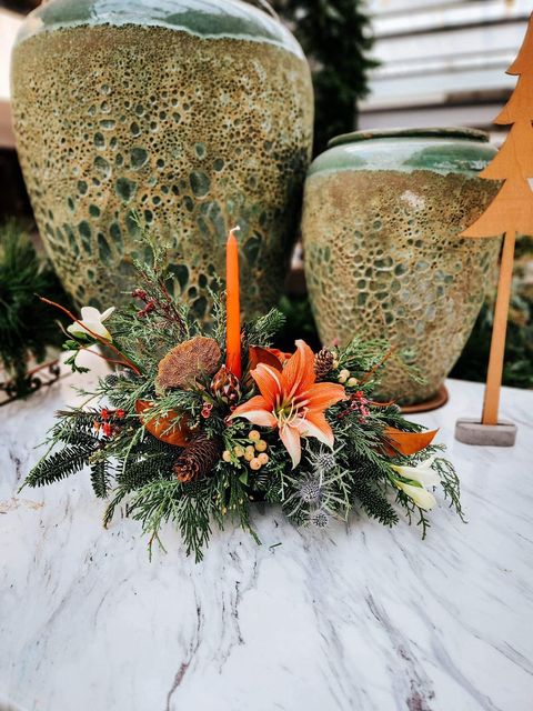 A fresh mix of evergreens and seasonal blooms adorned with a seasonal candle. Please select your choice of white or red for your centerpiece.