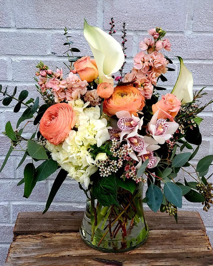 Make Someone’s Day is a gorgeous mix of shades of pink flowers including calla lilies, roses, cymbidium orchids, and hydrangeas.