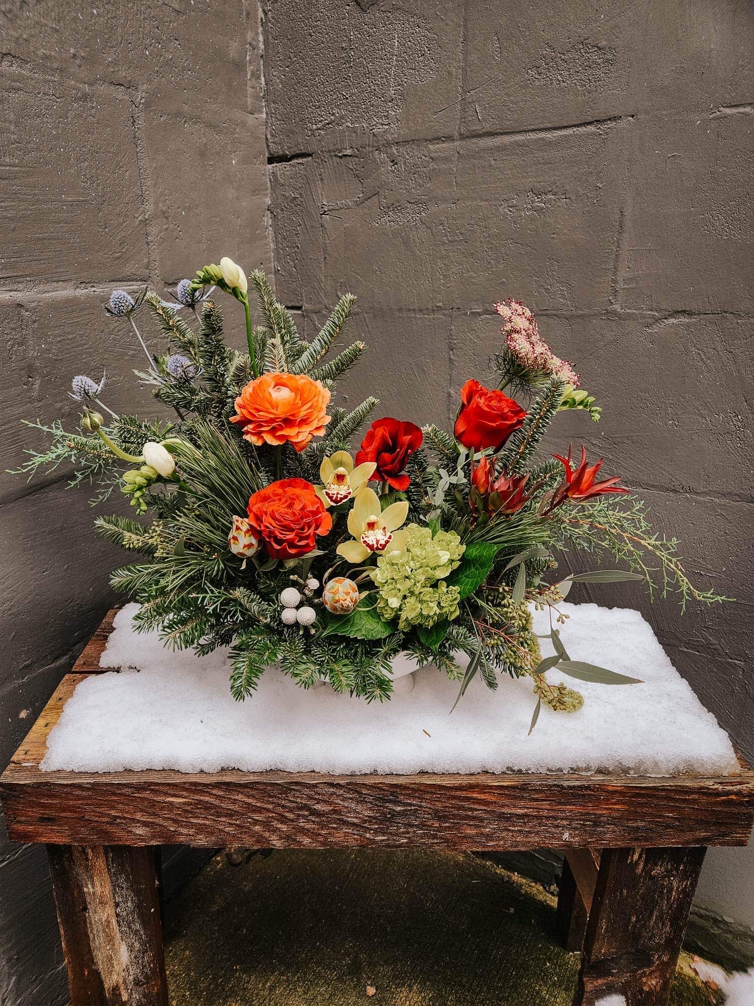 A beautiful Holiday arrangement including unique blooms for your celebrations this season.