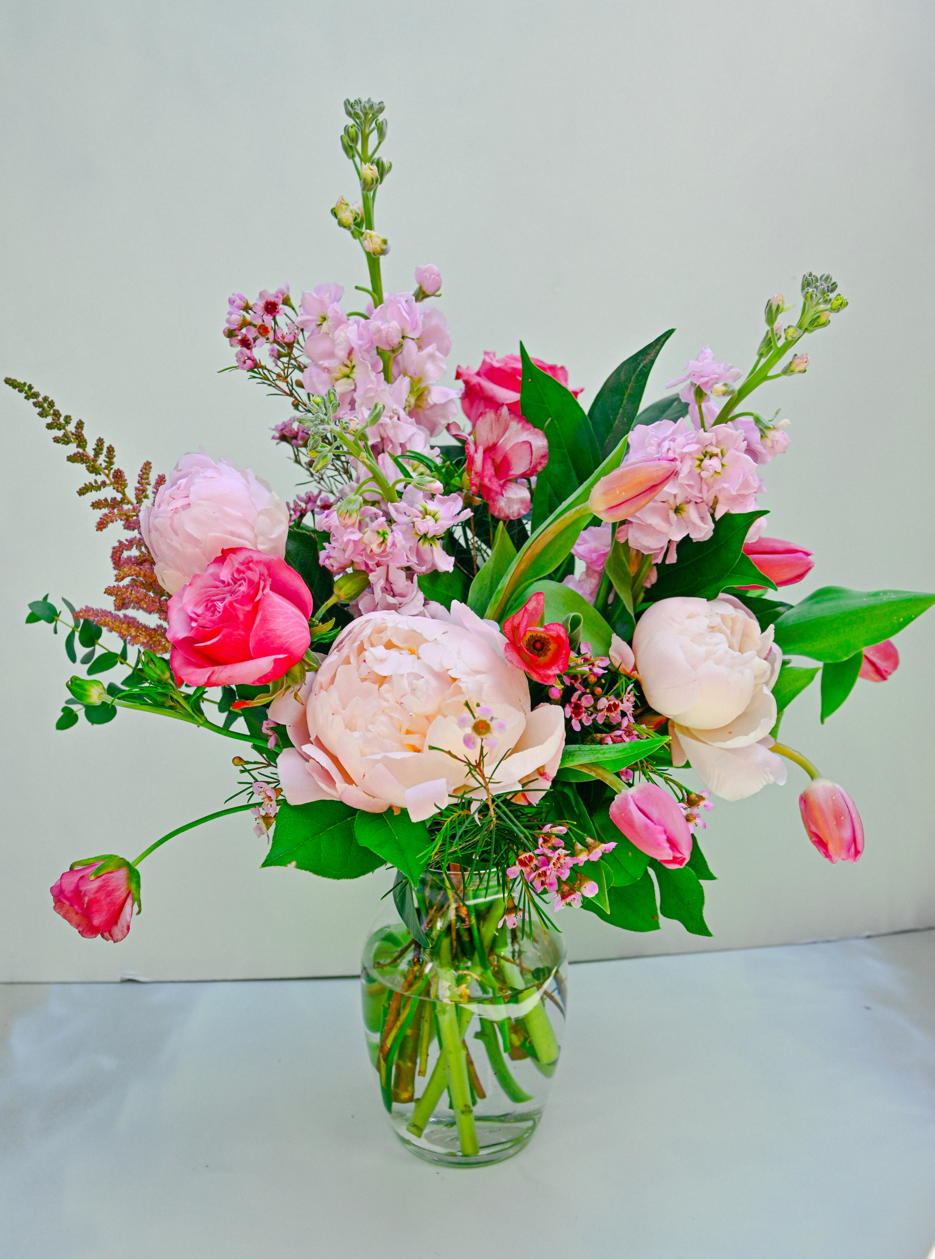 Pretty in Pink features pink peonies, poppies, and an array of delicate blooms dancing in harmony. Their petals are a symphony of blush and coral, exuding an irresistible charm. This vibrant bouquet celebrates femininity and joy, a radiant tribute to the beauty found in every shade of pink.