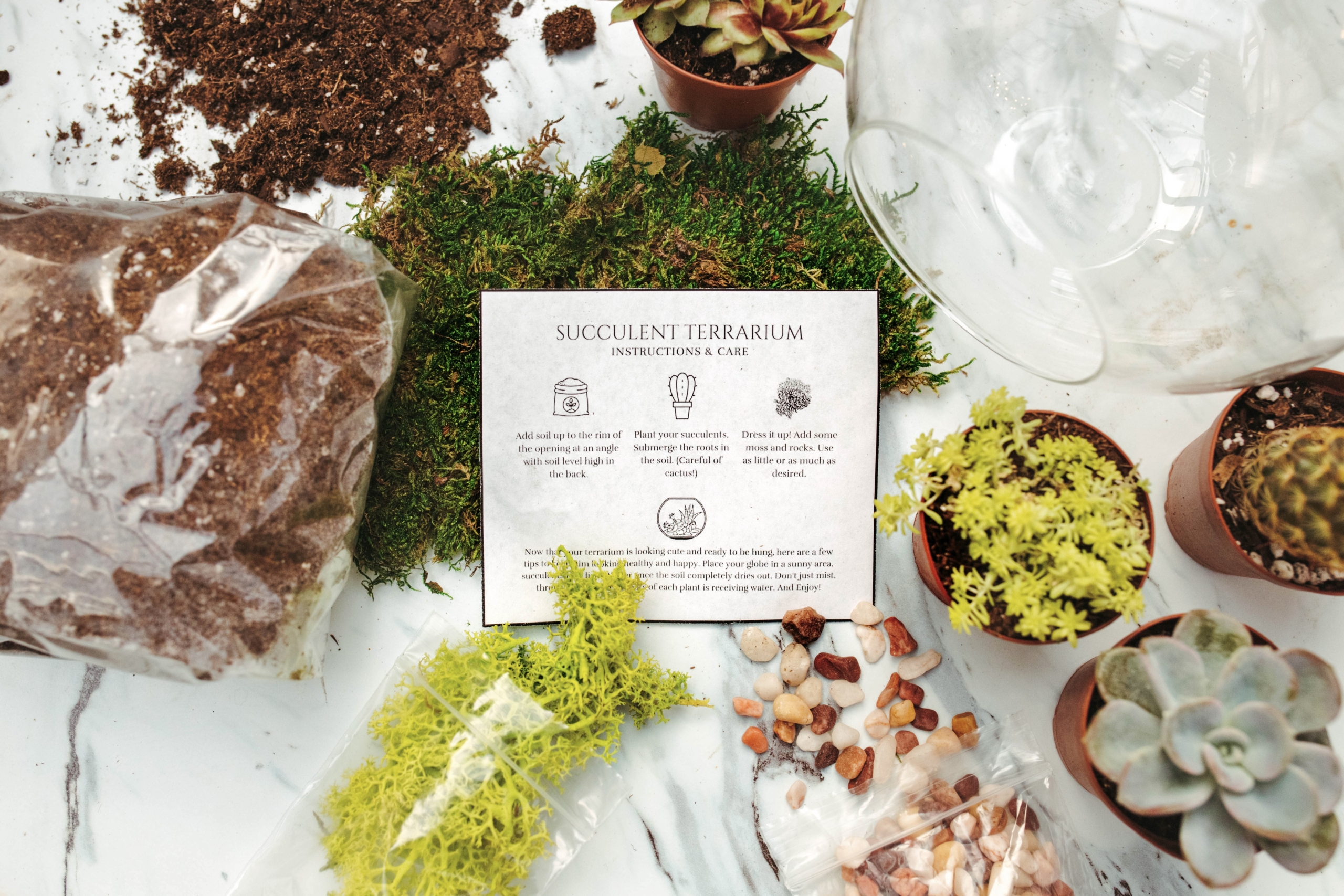This kit includes a glass globe, 4 succulents, soil, moss, rocks, and an instruction and care sheet.