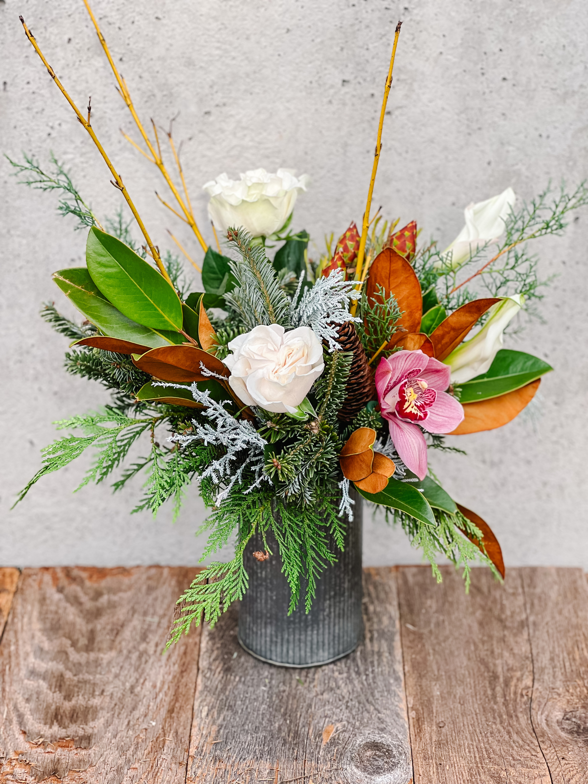 Winter Wishes: A fresh mix of evergreens and seasonal blooms.